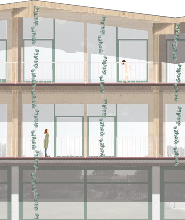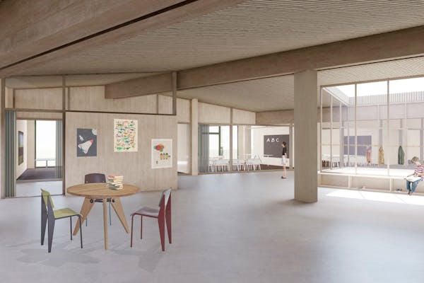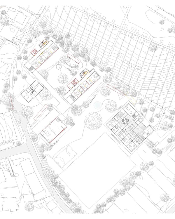 Erweiterung und Gesamtsanierung Volkschule Stöckacker Bern, Wettbewerb im offene Verfahren. Das Projekt, das zu den zehn Finalisten gehörte, sieht ein Gebäude aus Holz vor, das unabhängig vom Rest des Komplexes im nordöstlichen Quadranten des Schulkomplexes errichtet wird.