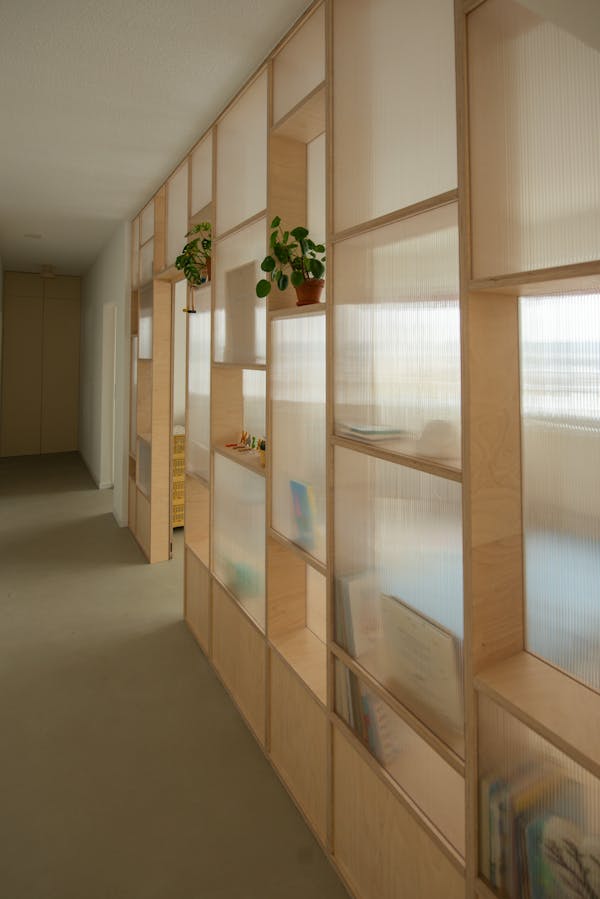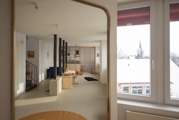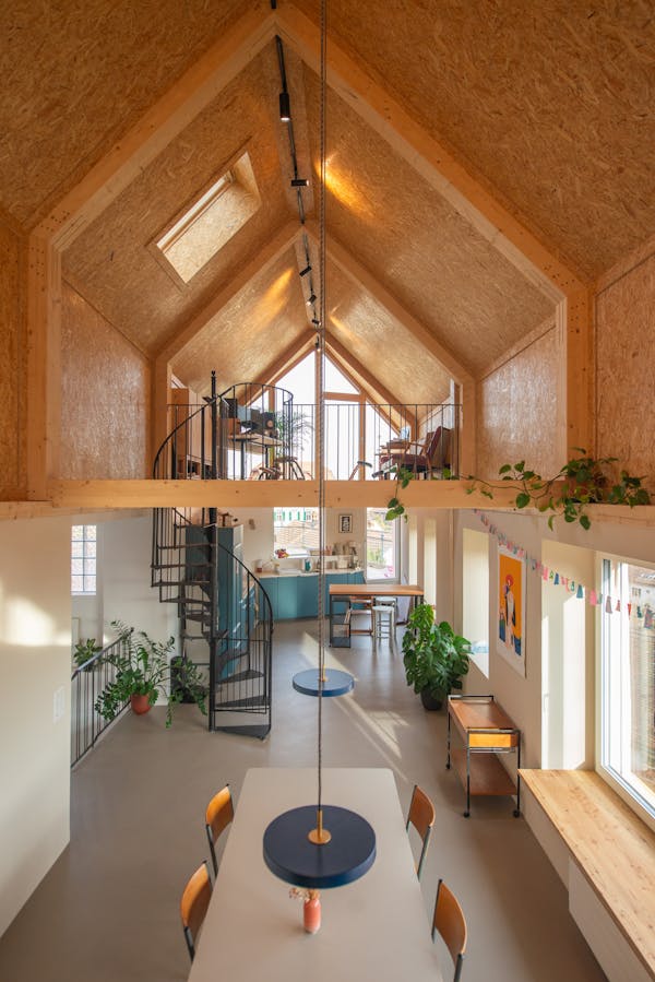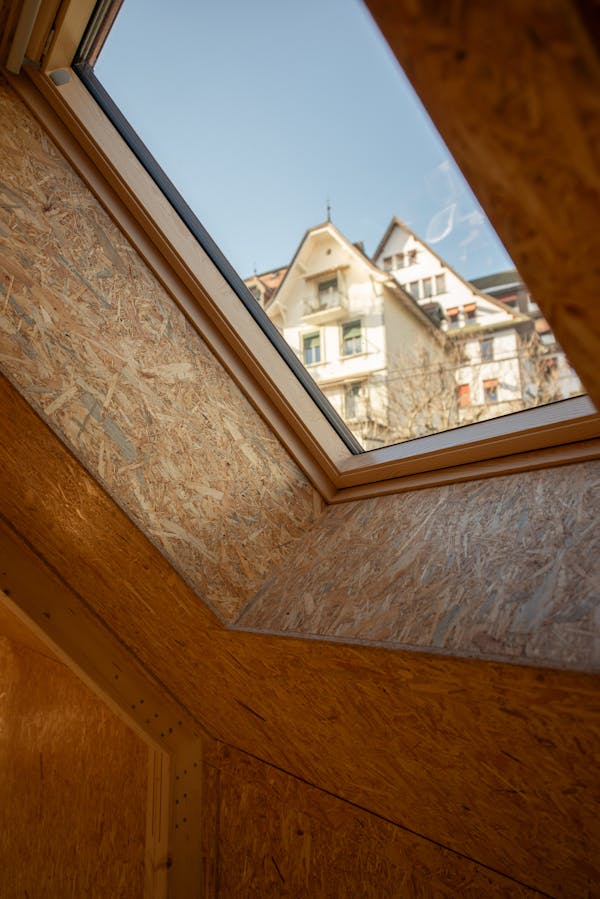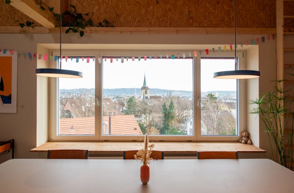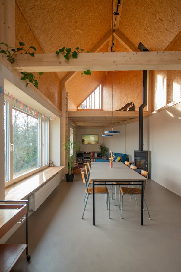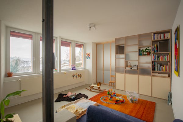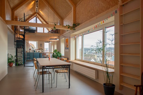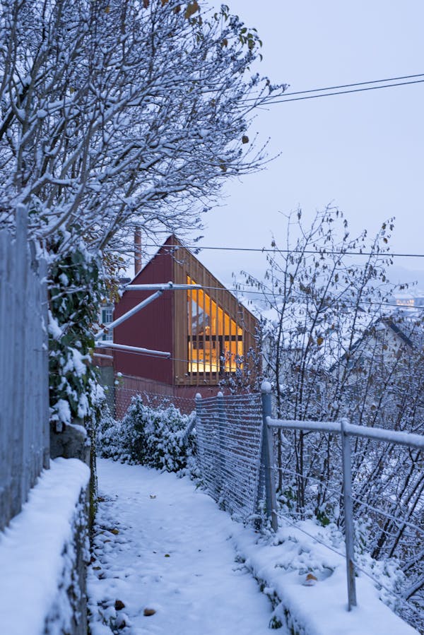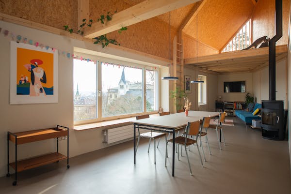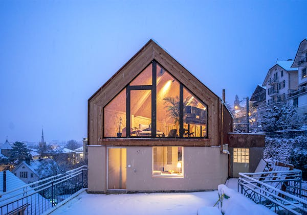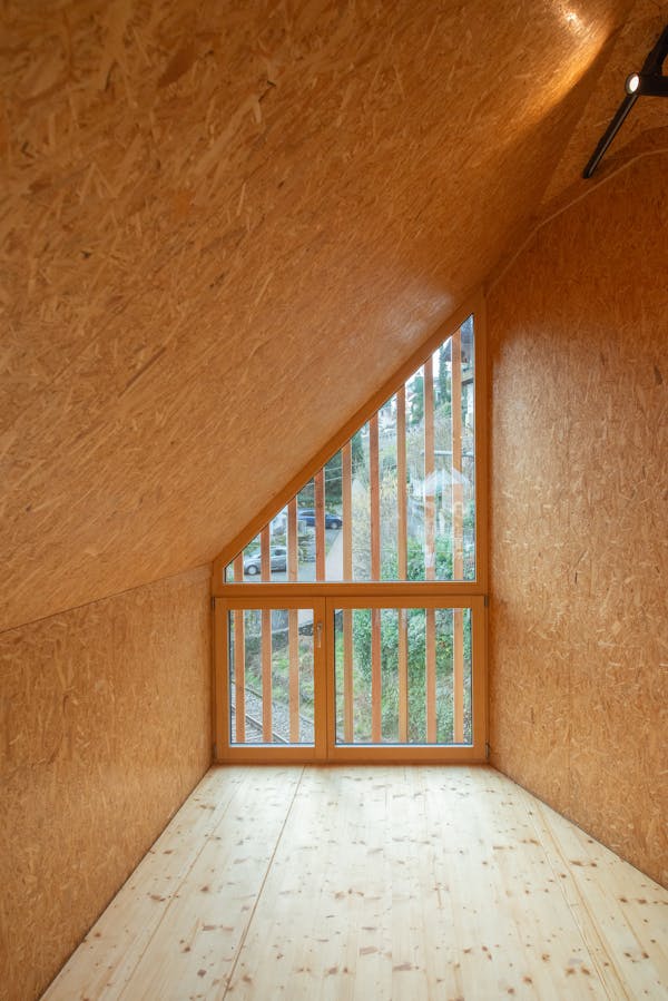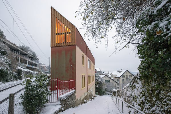 Rehaussement de la toiture et rénovation globale d’une maison individuelle à Bienne/Biel. Le bâtiment, initialement construit dans les années 1860 pour une petite entreprise industrielle, a fait l’objet de plusieurs transformations et agrandissements jusqu’en 1927. Il se situe dans un contexte particulier, comme seule habitation dans l’écartement des voies des CFF. Le projet est né de l’idée de profiter du renouvellement nécessaire de la toiture pour créer un nouvel espace sous combles. La réglementation permet une élévation significative de la façade, ainsi que la création d’un étage supplémentaire. Le projet conserve presque inchangées les proportions extérieures de la façade existante et joue sur la thématique d’une maison sur la maison. Ainsi, certaines lignes de l’ancienne toiture restent inchangées et définissent la limite entre l’ancien et le nouveau, créant une forme de contraste. Les murs de genou et les surfaces de toit sont uniformément habillés de plaques en fibres-ciment ondulé. Ce matériau offre des avantages acoustiques et se montre peu sensible à la poussière d’abrasion générée par la voie ferrée. Des recherches approfondies et des réflexions ont conduit à concevoir des plans permettant de recycler et réutiliser une grande partie du bois de la structure. Les gouttières en cuivre existantes seront intégrées au nouveau volume grâce à l’étude d’un détail spécifique. L’impossibilité d’installer une grue à proximité de la voie ferrée a nécessité un montage entièrement planifié par hélicoptère.