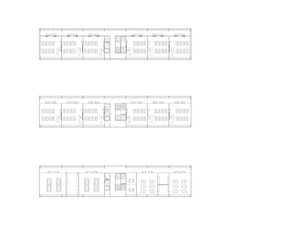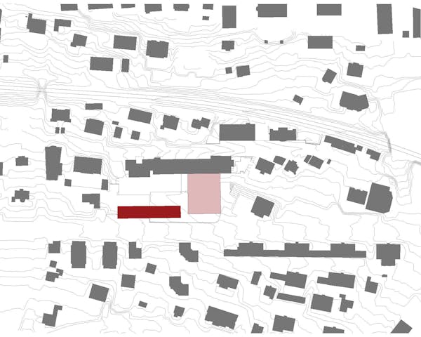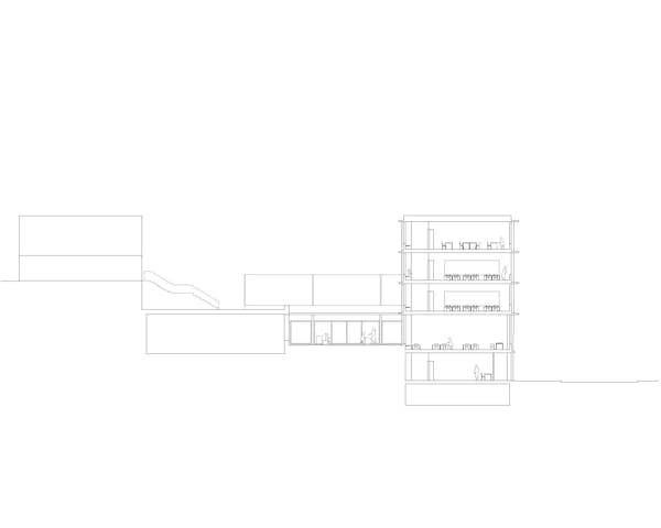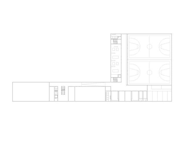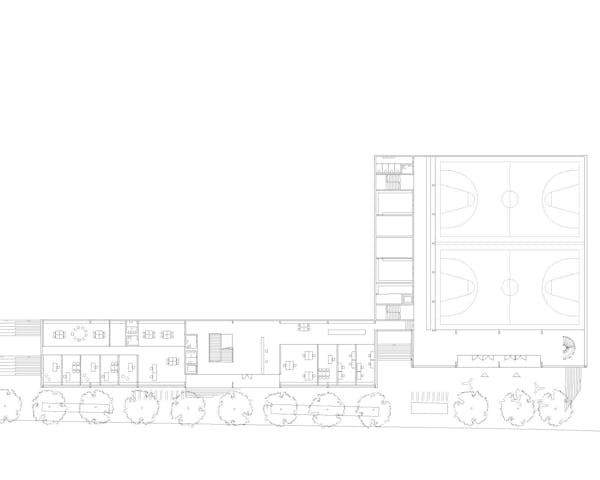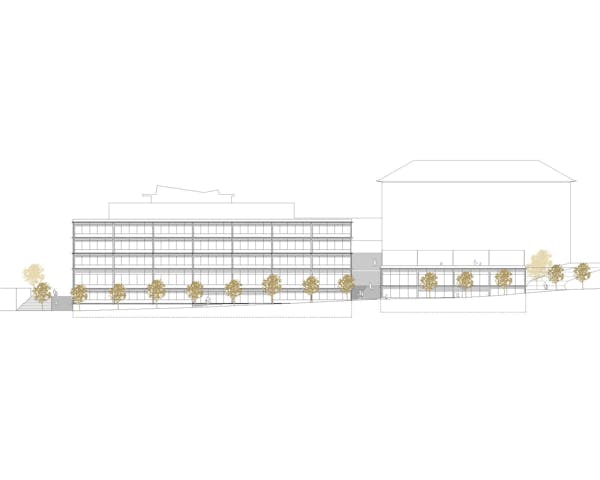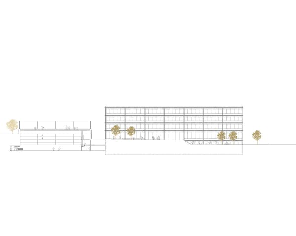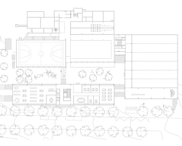 Die Anordnung der Neubauten ermöglicht die Beibehaltung der zentralen Verbindung über die Nord Süd-Aussentreppen, die bis auf die Höhe der Rue Charles-Ferdinand Ramuz verlängert wird. Die Rue des Ecoliers bleibt erhalten und wird durch eine neue Nord-Süd-Verbindung im Westen des Geländes ergänzt, die zum neuen Eingang des bestehenden Schwimmbads und der Turnhalle führt. Die neuen Volumen zeichnen einen langgestreckten, geschützten Hof auf zwei Ebenen, der mit Tribünen ausgestattet ist. Er liegt auf gleicher Höhe mit den Eingängen der neuen Gebäude im oberen Erdgeschoss und befindet sich auf halbem Weg zwischen dem öffentlichen Platz und dem Hauptkollegium. Die Abstufung der den Schülern zugänglichen Bereiche ermöglicht eine Differenzierung nach Alters gruppen und eine physische, visuelle und akustische Distanz zum Strassenverkehr. Die überdachten Pausenhöfe und die Bepflanzung untermalen die Schulhöfe mit geschützten Inseln. Das Viertel Avenue des Collèges weist ein städtebauliches Raster auf, das für eine Hangla - ge charakteristisch ist, mit senkrecht zum Hang verlaufenden Strassen und Gebäuden, die dem Panorama zugewandt sind, aber auch einzigartig mit einer regelmässigen Anordnung in nicht zusammenhängender Reihenfolge, die in ihren Zwischenräumen Belvedere schafft. Das Collège Principal, der westliche Anbau, das Collège de Jules Loth und der Pavillon Pierre D'Arvel bilden ein Ensemble aus einzelnen Elementen, das durch terrassenförmige Aussenbereiche ergänzt wird, die teilweise auf den Dächern von schulischen und öffentlichen Sportanlagen angelegt sind. Das neue Schulgebäude fügt sich in dieses System ein und vervollständigt es durch seine parallele An - ordnung zur Strasse und die neue Aussichtsplattform, die von den Sportplätzen gebildet wird. Am Rand des bebaubaren Bereichs positioniert, begrenzt es die Schuleinheit, während die Front der Sporthalle zu - rückgesetzt ist und einen öffentlichen Raum schafft, der mit der Strasse in Verbindung steht. Das Dach des Turnhallengebäudes nimmt die Form einer Terrasse an, die auch eines der Pausenplateaus der Schule bildet.